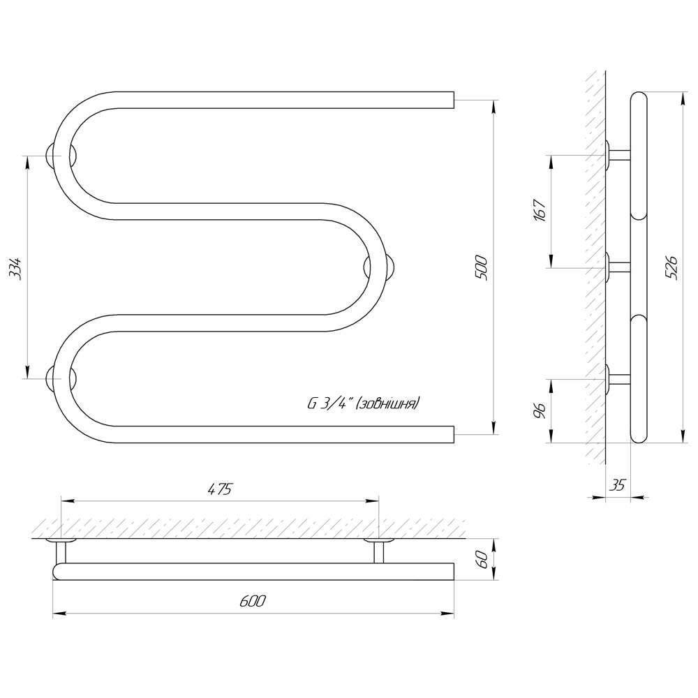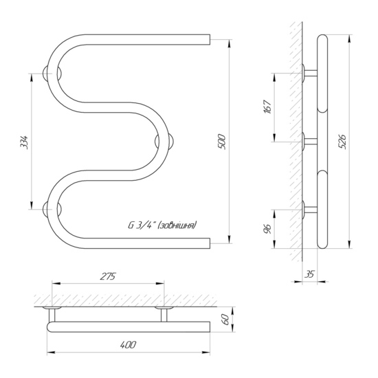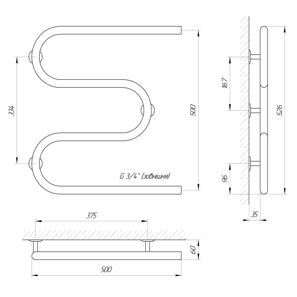 Полотенцесушитель водяной, модель — Laris Змеевик 25 РС3 межцентровое расстояние 500 мм 3/4″ изготавливается из зеркально отполированной высококачественной нержавеющей трубы и предназначен для обогрева ванных комнат и сушки полотенец и белья.